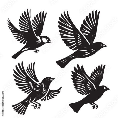 A minimalist, beautiful linocut illustration of a flying Grosbeak bird in silhouette. This black vector artwork captures the elegant form and graceful movement of the bird.