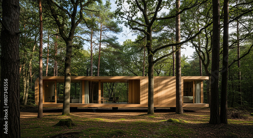 A minimalist capsule-shaped house in a natural forest setting, with sunlight and trees.