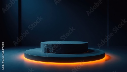 stage, platform, dais, display, presentation, showcase, product, design, modern, minimalist, dark, abstract, background, studio, empty, space, light, glowing, orange, circle, round, stone, texture, rough, surface, concrete, material, architecture, interior, room, spotlight, illumination, vibrant, artistic, creative, elegant, sleek, simple, composition, graphic, element, style, shape, form, geometry, perspective, depth, shadow