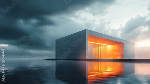 A minimalist, glowing building blending seamlessly into a digital landscape