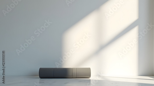 A minimalist gray foam roller on a light surface, illuminated by soft shadows from a bright window, creating a calm and tranquil ambiance