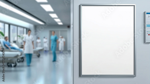 A minimalist, high-resolution image featuring an empty poster frame on a pristine white wall, with medical professionals moving about in the blurred background. Perfect for healthcare, medical, and in