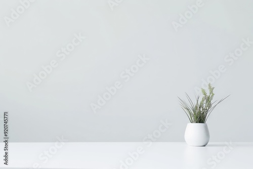 A minimalist image of a simple white vase holding a green plant, placed on a clean white table, exuding elegance and simplicity in modern interior design.