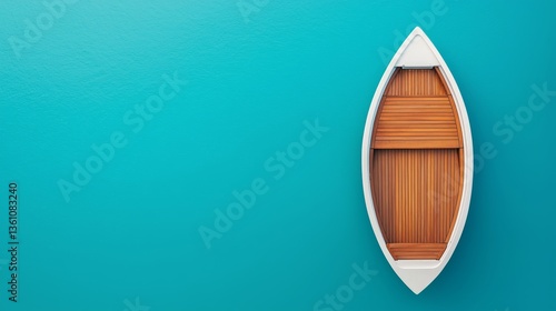 A minimalist image of a small, white boat with wooden accents, set against a vibrant turquoise background, evoking a serene and tranquil vibe.