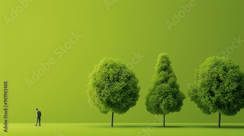 A minimalist image showcasing a solitary figure walking past three lush green trees in an open field. The simplicity of the composition and the consistent green tone create a peaceful and modern