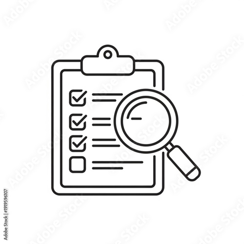 A minimalist line art illustration of a clipboard with a checklist and magnifying glass