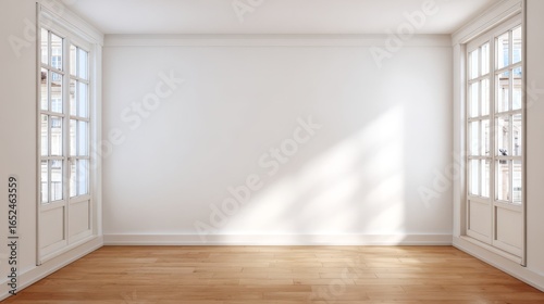 A minimalist living room with clean lines, white walls, and wooden floors, exuding simplicity.