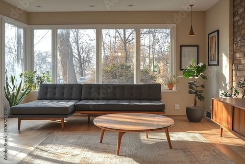 A minimalist, mid century modern interior in the living room with a dark gray sofa and round table. Generative AI