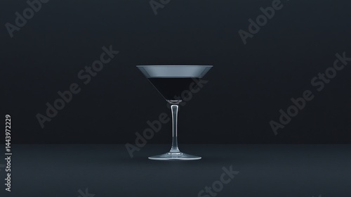 A minimalist photo of a martini glass filled with a dark liquid against a plain black background.
