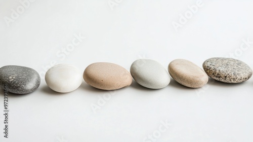 A minimalist photo of smooth, polished stones arranged in a zen-like pattern on a white surface