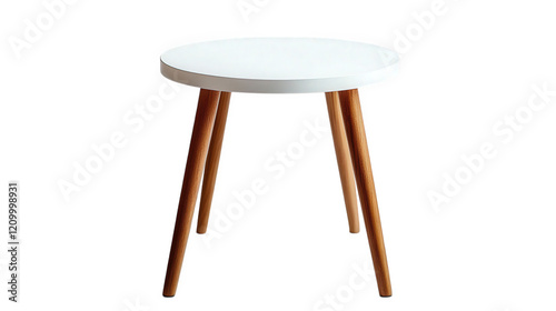 a minimalist round table with a white top and wooden legs. designed for functional use in various settings such as homes or offices this piece exemplifies modern furniture design. emphasizing simplici