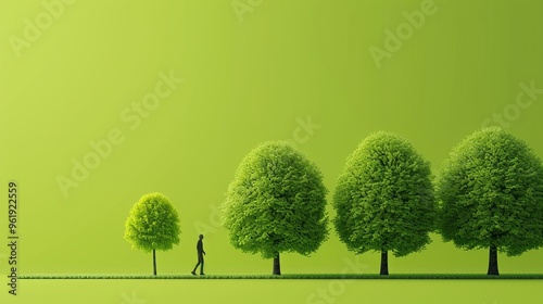 A minimalist scene featuring a solitary figure walking beside four lush, stylized trees in an open field. The green tones and simple composition create a serene and modern visual, perfect for
