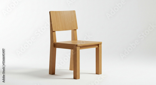 A minimalist wooden chair stands elegantly against a plain white backdrop, showcasing its simple design and natural wood grain in a furniture setting.