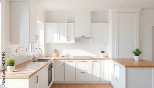 A minimalistic kitchen wallpaper featuring clean white cabinets, light wooden countertops, and subtle decor elements like a small potted plant, creating a bright and modern home aesthetic.
