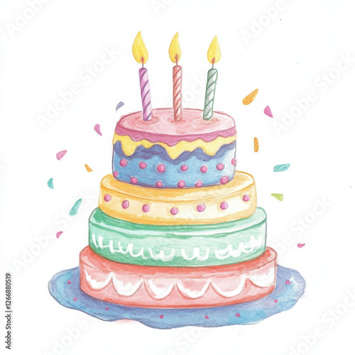 a minimalistic pastel illustration made by a 5-year-old kid. birthday cakes. plain primitive forms. single color. white background