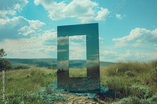 A mirror sitting in the middle of a field. Suitable for reflection concepts
