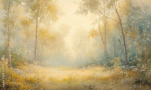 forest, tree, sunlight, leaf, wood, nature, landscape, green, summer, light, bright, peaceful, path, meadow, grass, hazy, morning, soft, dreamy, calm, serene, tranquil, beauty, yellow, gold, artwork, painting, art, canvas