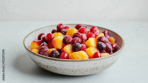 A mix of freeze-dried cranberries and peaches in a bowl, with fine details popping against a plain white backdrop.