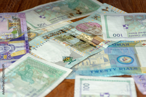 A mix of Omani Riyal Currency Bills spread out on the table.