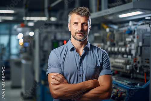 A mixed adult male production and assembly manager standing in front of the CNC machine control panel and looking at the camera. He has his arms crossed. The manager looks confident
