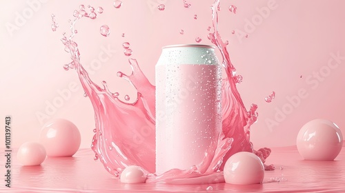 A mockup of a drink can with a dynamic liquid splash on a pastel background, creating a vibrant and energetic product display.