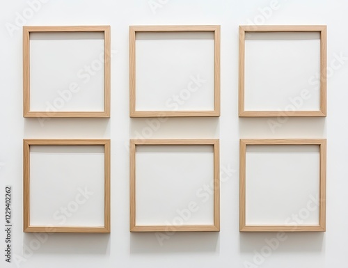A mockup of six blank square wooden frames on the wall, each frame is of different sizes, and they have a white background.