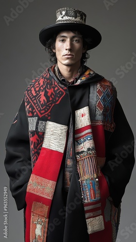 model, traditional, clothing, argentine, attire, fashion, culture, heritage, textile, vibrant, peaceful, elegance, menswear, ethnic, craftsmanship, colourful, style, garment, design, pattern, accessory, celebration, festival, showcase, unique, identity, artistry, portrait, hand-made, contemporary, historical, beauty, expression, lifestyle, tradition, representation, wool, fabric, outfit, artisan, influence, trend, look, charisma, modelling, social, interaction