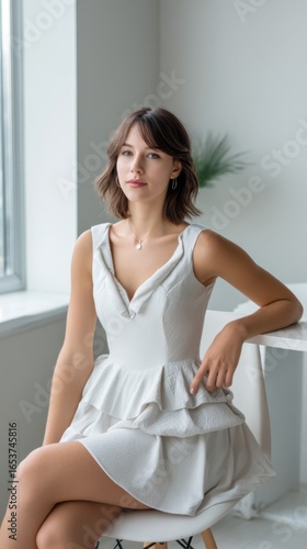 A model in a light dress with a peplum poses in a photo studio interior with soft lighting, minimalist background, portrait angle
