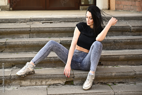 A model sits on the stairs of a building. Full-length portrait in spring weather outdoors, caucasian brunette girl with a slim figure in jeans and a black T-shirt.