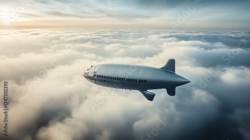 airship, sky, cloud, flight, aircraft, transport, travel, aviation, aerial, vehicle, silver, metallic, design, futuristic, technology, floating, atmosphere, horizon, light, sun, dawn, dusk, evening, morning, weather, puffy, fluffy, white, blue, grey, structure, exterior, shape, engine, propeller, fin, body, streamlined, elevation, high, altitude, scenic, view, perspective, passenger, engineering, up high, air