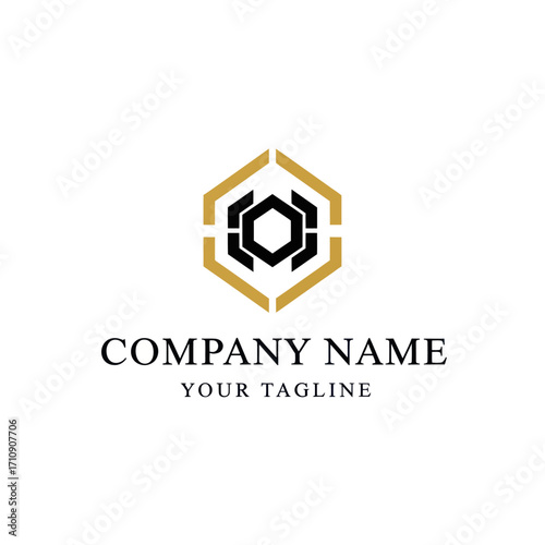A modern and geometric logo design featuring a hexagonal emblem with black and gold accents, suitable for a company name and tagline.