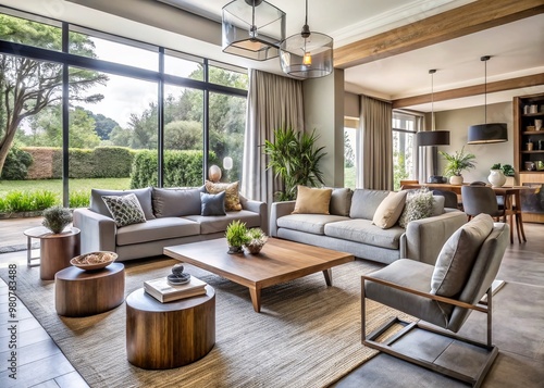 A modern and spacious living room in a Gauteng home, featuring stylish and affordable furniture, neutral tones, and