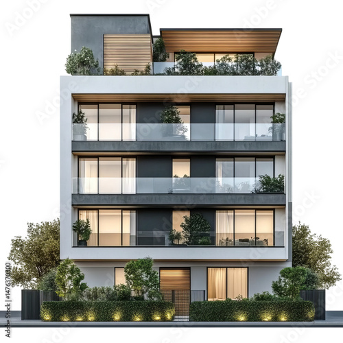 A modern apartment building with large balconies and plants on the balcony, Transparent Background Png Format file