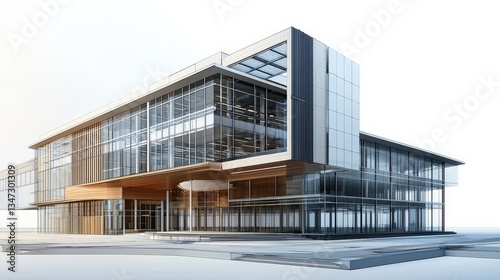 A modern architectural design featuring glass and wood elements, showcasing a spacious, contemporary building with clean lines and an open layout.