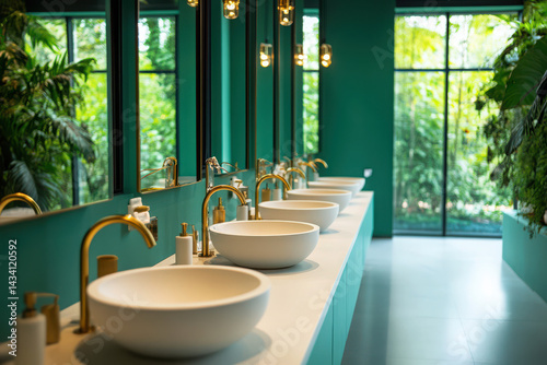bathroom, sink, faucet, brass, counter, window, greenery, light, minimalism, cleanliness, relaxation, design, wall, teal, brightness, functionality, tile, modern, elegance, texture, harmony, openness, calmness, aesthetic, style, ambience, home, clean, uncluttered, refreshing