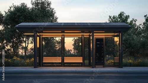 bus, stop, shelter, solar, panel, glasses, structure, urban, design, nature, environment, transportation, public, seating, waiting, community, landscape, evening, modern, architecture, city, amenity, accessibility, safety, convenience, efficiency, landscaping, tree, flower, sunlight, shadow, pavement, road, transit, service, infrastructure, environmentally friendly, sustainable, energy, technology, travel, commuter, space, aesthetic, contemporary, functional, urbanism, comfort