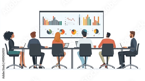 A modern business meeting with diverse professionals analyzing data on a large screen, discussing strategies and trends.