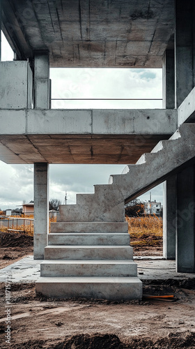 A modern concrete-and-steel building under construction, showcasing exposed beams, scaffolding, vertical framing, and industrial textures