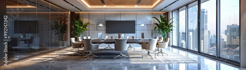 A modern conference room featuring sleek furniture, large windows with city views, and stylish decor, perfect for meetings and presentations.