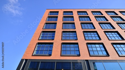 A modern corporate building in the city. The blue sky is reflected in the buildings large glass windows. Glass facade.