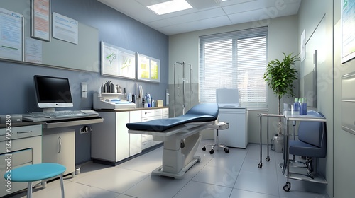 room, clinic, medicals, exam, office, health care, doctor, patient, treatment, equipment, table, bed, computer, screen, keyboard, desk, chair, stool, cabinet, storage, window, blind, light, ceiling, plant, display, chart, supply, bottle, sterile, clean, modern, interior, design, white, blue, wall, tiled, professional, building, indoor, health, practice, facility, furniture, lighting, contemporary