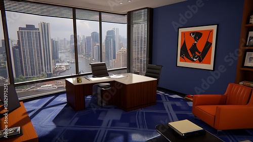 office, desk, chair, window, view, city, building, skyscraper, artwork, painting, frame, blue, orange, black, furniture, interior, modern, executive, elegant, professional, workspace, skyline, river, water, blind, light, floor, carpet, wood, design, contemporary, stylish, luxury, document, book, decor, shelf, detail, cosy, armchair, plant, abstract, pattern, bright, corner, empty, sunlight