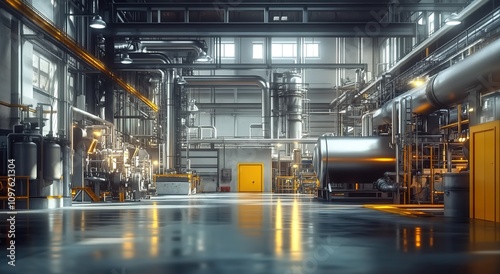 modern, industrial, factory, interior, roomy, bright, ceiling, window, natural, light, entrance, floor, smooth, dark, lighting, equipment, round, mixer, reactor, pipe, crane, yellow, large, lifting, arm, machine, device, container, organised, neat, quiet, empty, atmosphere, setting, structure, facility, industrialized, mechanized, interior design
