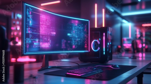 technology, computer, desktop, monitor, keyboard, mouse, gaming, neon, light, setup, screen, digital, futuristic, tech, modern, future, display, hardware, equipment, interface, graphic, virtual, reality, network, cyberspace, cyber, game, electronic, device, contraption, workspace, desk, office, room, home, studio, design, style, aesthetic, colours, glow, background, wallpaper, abstract