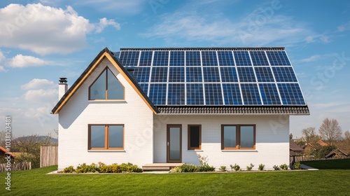 A modern home featuring solar panels on the roof, set against a clear blue sky and green lawn, highlighting eco-friendly energy solutions.