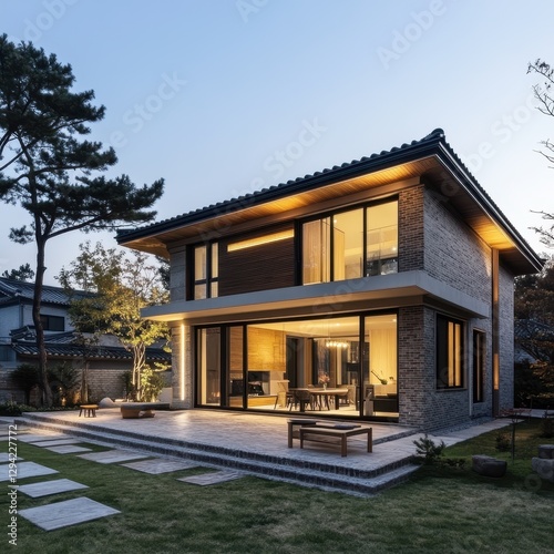 house, home, design, modern, architecture, brick, stone, grass, patio, tree, building, exterior, garden, evening, landscape, contemporary, luxury, outside, yard, residential, construction, lighting, illuminated, light, dark, brickwork, green, wood, architectural