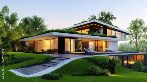 A modern house roof with a clean, flat design and green rooftop garden, showing eco-friendly architecture.