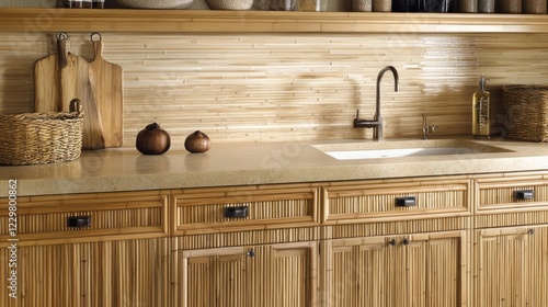 A modern interior showcasing bamboo cabinetry and soft neutral decor.