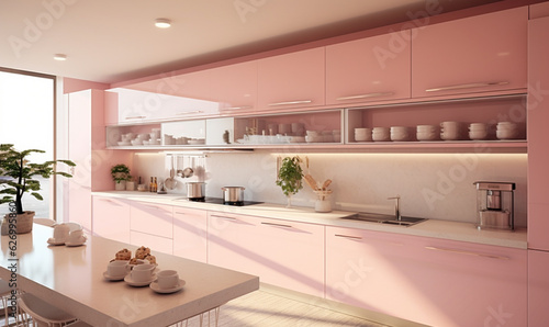 a modern kitchen with a pink color scheme