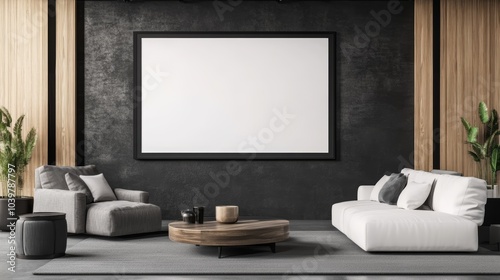 A modern living room featuring a large blank on a textured wall, complemented by stylish seating and a rustic coffee table.